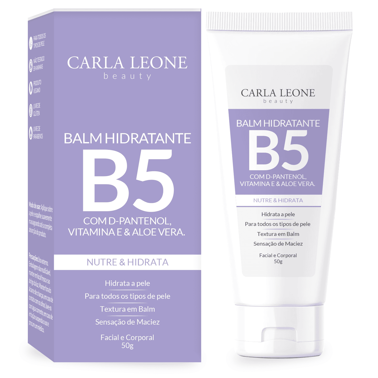 Balm Hidratante B5 Carla Leone é um produto desenvolvido para todos os tipos de pele, possui em sua composição B5 (D-Pantenol), Vitamina E e Extrato Glicólico de Aloe Vera que hidratam e nutrem a pele do corpo e do rosto. Possui toque seco, macio e forma um filme de cobertura com sensação única.